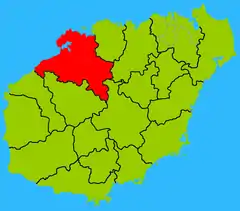 Nà dà zhèn, nán fēng zhèn, yǎ xīng zhèn, hé qìng zhèn, dàchéng zhèn, xīn zhōu zhèn, guāng cūnzhèn, dōng chéng zhèn, zhōng hé zhèn, é màn zhèn, lán yáng zhèn, wáng wǔ zhèn, pái pǔ zhèn, Hǎi tóu zhèn, mù táng zhèn, báimǎ jǐng zhèn y sān dōu zhèn (那大镇、南丰镇、雅星镇、和庆镇、大成镇、新州镇、光村镇、东成镇、中和镇、峨蔓镇、兰洋镇、王五镇、排浦镇、海头镇、木棠镇、白马井镇 y 三都镇)