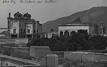 - Vista del patio de la casa de fieras en la esquina suroeste del palacio, mirando al norte, con el minarete de la Mezquita Lalla Mina a la derecha (foto de 1913)