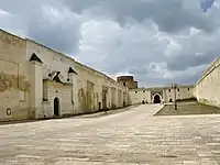 En el lado occidental de la plaza hay una puerta de estilo arquitectónico italianizante que pertenece a la Makina (Dar al-Makina), una antigua fábrica de armas (también llamada Dar al-Silah) creada por Moulay Hassan en 1886 con la ayuda de oficiales italianos.[6][1] Sin embargo, en su origen, esta muralla occidental era en realidad un gran acueducto meriní construido en 1286 para llevar el agua al jardín de la Mosara, en el norte; el tenue contorno de sus arcos aún puede verse hoy en día dentro de la estructura de la muralla.[3] La puerta norte del Nuevo Mecúar, conocida como Bab Kbibat es-Smen ("Puerta del Nicho de la Mantequilla"), también data de la construcción de 1886, aunque otra puerta llamada Bab Segma (que formaba parte de los jardines meriníes) también da nombre a la zona.[6]