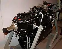 ![]() Motor Gipsy Queen expuesto en el Museo de la Real Fuerza Aérea Británica de Cosford, con partes transparentes que permiten apreciar la caja de reducción tras el eje de la hélice, los seis cilindros refrigerados por aire en posición invertida, y sobre los mismos, el cárter seco. | ||