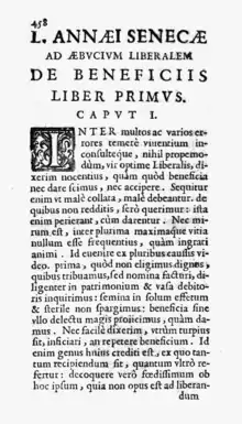 De Beneficiis (Latín: 'De los Beneficios') es una obra de Séneca (ca. 4 BC - 65 AD), conformada por siete libros. Forma parte de una serie tratados sobre fenómenos naturales y de ensayos morales o ("Diálogos") que exploran temas filosóficos como la providencia, la perseverancia, la ira, el ocio, la tranquilidad, la brevedad de la vida, el perdón, la felicidad y el intercambio de regalos.[1]