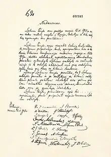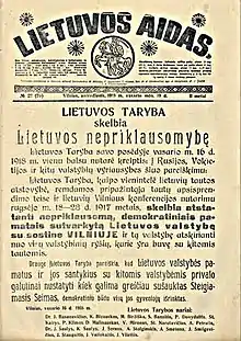 La Declaración de Independencia de Lituania (en lituano Lietuvos Nepriklausomybės Aktas) o declaración del 16 de febrero fue firmada por el Consejo de Lituania el 16 de febrero de 1918,[1] proclamando así la restauración de una Lituania soberana y democrática, con capital en Vilna. La declaración fue firmada por los veinte signatarios presentes en la reunión,[2] presidida por Jonas Basanavičius.[2] La declaración fue el resultado final de una serie de resoluciones internacionales, incluyendo la emitida por la Conferencia de Vilna y la declaración del 8 de enero. Hasta la declaración, el camino que se tuvo que seguir fue largo y complejo ya que el Imperio alemán no dejó de presionar en ningún momento al consejo con el fin de formar una alianza. El consejo tuvo que maniobrar cuidadosamente entre los alemanes, cuyas tropas estaban presentes en Lituania, y las exigencias del pueblo lituano.