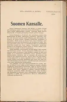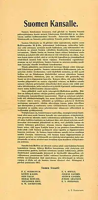 - El pueblo de Finlandia, por este acto, tomó su destino en sus manos: una medida justificada y demandada por las condiciones actuales. Los habitantes de Finlandia sienten que no pueden cumplir con su deber nacional no las obligaciones humanas universales, sin una completa autonomía. El deseo de un siglo de antigüedad por la libertad espera ahora su cumplimiento, el pueblo de Finlandia tiene que dar un paso adelante como nación independiente entre las demás naciones del mundo.