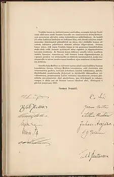 Estos fueron los senadores que firmaron la Declaración:[3] P.E. Svinhufvud, Kyösti Kallio, Onni Talas, Heikki Renvall, Alexander Frey, O.W. Louhivuori, E.N. Setälä, Jalmar Castrén, Arthur Castrén, Juhani Arajärvi y E.Y. Pehkonen.