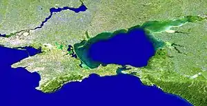 ![]() Foto satélital del Mar de Azov con el Estrecho de Kerch en el centro | ||||