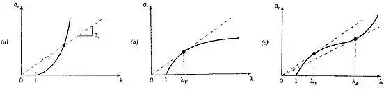 En la figura (a), aparece una curva cóncava hacia arriba. Esto indica que no hay caída de la elasticidad, por lo que el material llegará a romperse antes de experimentar estiramiento o estrechamiento. En la figura (b), aparece un punto específico definido por la recta tangente desde el origen (coincidente con la recta secante), en el que . Una vez superado este valor, la pendiente se vuelve más pequeña que la línea secante y comienza a aparecer el estrechamiento. En la figura (c), existe un punto donde el material comienza a perder rigidez, pero cuando , se produce un alargamiento elástico, pero después de este todo el material experimentará un estiramiento y finalmente se romperá. Entre y , el material en sí no se estira, sino que solo comienza a estirarse la zona del estrechamiento.
