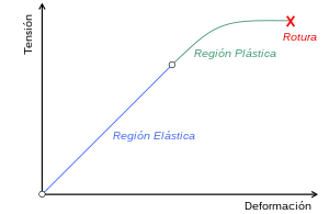 Bajo tensión de tracción, la deformación plástica se caracteriza por la aparición de una región de endurecimiento por deformación y de una región de estricción y finalmente, por un estado de fractura (también llamado de rotura). Durante el endurecimiento por deformación, el material se vuelve más resistente debido a la formación de dislocaciones atómicas. La fase de formación de un cuello de estricción se caracteriza por una reducción del área de la sección transversal de la muestra. El fenómeno se produce después de que se alcanza la tensión máxima. Durante el estrechamiento, el material ya no puede soportar la tensión máxima, y las tensiones localizadas en la muestra aumentan rápidamente. La deformación plástica termina con la fractura del material.
