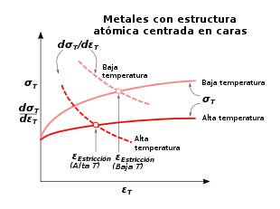 Esta figura también muestra la dependencia de la tensión de formación de estricciones a diferentes temperaturas. En el caso de los metales con estructura atómica centrada en caras, ambas curvas de tensión-deformación en su derivada dependen en gran medida de la temperatura. Por lo tanto, a temperaturas más altas, el estrechamiento comienza a aparecer incluso con un valor de deformación más bajo.