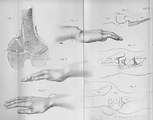 La deformidad es consecuencia de un crecimiento desorganizado de la epífisis radial, lo que conlleva un arqueamiento del radio, una fusión prematura de la epífisis y un retraso en el desarrollo de la parte cubital y palmar de la epífisis radial distal. Estas alteraciones causan una inclinación palmar y cubital de la superficie articular radial distal, una traslación palmar de la mano y de la muñeca, una dislocación dorsal del cúbito y huesos carpiales en forma de cuña.