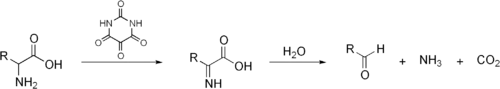 La reacción describe la degradación oxidativa irreversible de α-aminoácidos con compuestos α-dicarbonilo a aldehídos o cetonas, que se acortan en un átomo de carbono. En la publicación original de Strecker, publicada en 1862, el aloxano se utilizó como agente oxidante y reaccionó con alanina, leucina y glicina,[1] seguido de la hidrólisis: