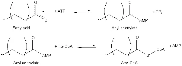 Los ácidos grasos deben ser activados antes de que puedan ser ingresados a las mitocondrias, donde ocurre la oxidación de los ácidos grasos. Este proceso se lleva a cabo en dos etapas catalizadas por la enzima acil-CoA sintetasa.