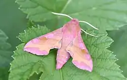 El cuerpo de la esfinge morada pequeña tiene tonalidades moradas y rosadas suaves, presentando una envergadura de 45 a 51 mm.