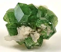 El demantoide es una variedad de granate andradita, de color verde brillante, a veces con tonos amarillos, utilizado a veces, cuando es transparente, como gema. Se considera el tipo de granate más valioso para este uso.[1] Los primeros ejemplares fueron encontrados hacia 1853 por un niño, como cantos rodados, entre las gravas del río Bobrovka, en Nizhnii Tagil, región de los Urales, Rusia. Inicialmente se consideró que se trataba de crisólito, o peridoto. En 1864, Nils Gustaf Nordenskiøld, lo identificó como una variedad cromífera de andradita. El nombre, propuesto por él deriva de la palabra de alemán antiguo Demant , que significa diamante, haciendo alusión a su brillo adamantino, que se asemeja al de esta gema.[2]