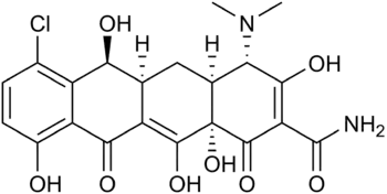 Demeclociclina (Declomycin, Declostatin y Ledermycin) es una tetraciclina derivada de una cepa de Streptomyces aureofaciens.[1]