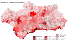 La distribución de la población es un factor de desequilibrio y contraste entre las distintas zonas de la geografía andaluza. En el año 2012 la densidad de población andaluza era de 96'83 hab/km², ligeramente mayor que la nacional.[3]