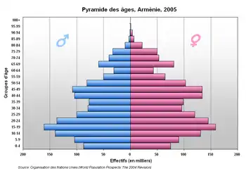 Población: 2 871 509[1][2] habitantes (2011). Esta cifra oficial es sobrestimada, en realidad no hay en Armenia más de 2 millones de habitantes, debido a una fuerte emigración no oficial y difícil de cuantificar.