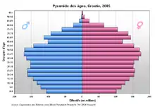 En 2008, Croacia tiene una población de 4.453.500 habitantes. La esperanza de vida es de 74,9 años. El 98,5% de la población está alfabetizada. El promedio de hijos por mujer es de tan solo 1,41 lo cual está provocando que su población se reduzca un 0,03% cada año.