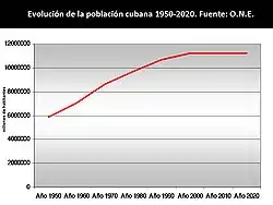 La República de Cuba tiene una población de 11 167 325 habitantes en 2012, según la Oficina Nacional de Estadística e Información (ONEI), organismo estatal encargado de llevar los datos demográficos cubanos.[1] Se trata del país más poblado del Caribe insular; sin embargo, su densidad de población (101,6 hab/km² según ONEI 2012) es menor que la de Haití, República Dominicana o Puerto Rico.[2] Se observan elevados indicadores sociales con respecto a los demás países de Latinoamérica, como la esperanza de vida, el índice de alfabetización y baja mortalidad infantil,[3] pobreza,[4] pobreza extrema y desempleo.[2] Ocupa la posición 64 entre los 178 países evaluados por el índice de desempeño ambiental[5] y la posición 72 de 189 países en el índice de desarrollo humano en 2019.[6]