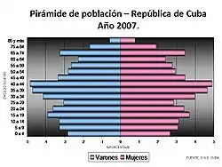 Según estimaciones de la O.N.E. para 2007, la población de 65 años o más correspondería al 11,6 % del total y la de 60 años o más, al 16,3 %, haciendo que Cuba sea el segundo país más envejecido de América Latina después de Uruguay. A su vez, con el correr de las décadas, se nota un paulatino descenso de la población entre 0 a 14 años, representando el 18,2 %. La edad promedio de la población es de 37,3 años, con unos 38 años para las mujeres y 36,6 para los hombres.[26] Recientes estudios han confirmado que para el año 2025, la isla será el país más envejecido de la región y uno de los 25 más envejecidos en todo el mundo.[27] En la región, Cuba integra junto a la Argentina, Chile y Uruguay, el grupo de países con una transición demográfica avanzada, caracterizada por poblaciones con natalidad y mortalidad moderada o baja, lo que se traduce en un crecimiento natural bajo, del orden del 1 %, aunque el crecimiento total de la población cubana rondó el 0,06 % en 2009.[28]
