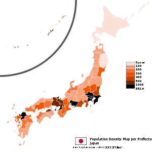 La densidad de población de Japón es de 340 personas y media por kilómetro cuadrado de acuerdo con el Informe de Estado sobre el Estado de las Poblaciones Mundiales de las Naciones Unidas para julio del 2009. Esto ubica a Japón en el puesto número 30 de la lista de países por densidad de población, justamente por delante de la India (336 por km²), y directamente detrás de Bélgica (391 por km²). La densidad de población de Japón ha ayudado a promover precios extremadamente elevados en la cotización de terrenos.