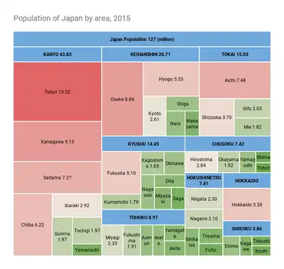 Distribución de la población[4] por Regiones (tonos azules) y Prefecturas (rojo: más poblados, verde: menos)