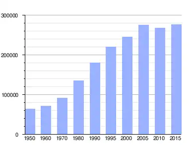 De los 277 375 habitantes 120 no especificaron edad y la muestra de edades termina en 75 años y más, sin desglose de edades de 80-84 años y 85 y más.[3]