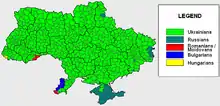 La demografía de Ucrania está constituida en un 57,8% por ucranianos étnicos, un 17,2% de población de origen ruso y un 22% de gente de paso. Los orígenes minoritarios en este país son: rumanos y moldavos (0,8%), bielorrusos (0,6%) tártaros (0,5%), polacos, húngaros, búlgaros, griegos, gitanos, judíos.