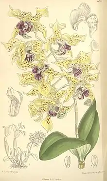 Es una orquídea de tamaño mediano, con hábitos de epífita. Esta orquídea tiene un pseudobulbo fusiforme, profundamente surcado, verdoso cuando son jóvenes, de color marrón con la edad, los tallos llevan de 2 a 4 hojas apicales, oblongo-ovadas, gruesas, coriáceas, obtusas apicalmente, de color verde oscuro por encima y más pálido por debajo. Los riegos frecuentes y fertilizantes asegurarán que florezca en pleno invierno y hasta principios del verano con una corta inflorescencia de 20 cm, en forma de racimo axilar que surge justo por debajo o en el vértice de nuevos y mayores bastones que lleva 8 o más flores aromáticas, con textura pesada y muy duraderas. Las plantas deben tener un invierno más seco aunque nunca deberá secarse por completo, hay que poner menos fertilizantes hasta que surgen los nuevos crecimientos en la primavera[2]