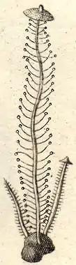 El tallo mide de 4 a 6 cm (1.6 a 2.4 pulgadas) de largo por 1 mm de grosor, aproximadamente de ancho igual en toda su longitud, y se estrecha hacia una "raíz" larga que termina en un esclerocio negro esférico, aproximadamente esférico.[13] El tallo puede estar enterrado profundamente en su sustrato.[15] La superficie del tallo es aproximadamente del mismo color que la tapa, con un fino polvo blanquecino en la superficie superior. En la parte inferior, el tallo es de color marrón, y tiene surcos finos que se extienden longitudinalmente hacia arriba y hacia abajo de la superficie.[14] La mitad inferior está cubierta con protuberancias cortas, parecidas a ramas, irregularmente dispuestas en ángulos rectos al tallo que miden 2-3 por 0.5 mm. Estas proyecciones son cilíndricas y afiladas, con extremos que están cubiertos con una cabeza de limo de conidios (esporas de hongos producidas asexualmente ). D. racemosa es la única especie de hongo conocida que forma conidios en las ramas laterales del tallo.[16] El escleroide del que surge el tallo es grisáceo acuoso y homogéneo en sección transversal (no dividido en cámaras internas), con una capa externa negra opaca delgada, y mide 3 a 6 mm (0.12 a 0.24 in) de diámetro.[13] El micólogo estadounidense Alexander H. Smith advirtió que los coleccionistas novatos suelen perderse el esclerotio la primera vez que encuentran la especie.[17] Se desconoce la comestibilidad de D. racemosa,[17] pero, como dice David Arora, los cuerpos frutales son "demasiado pequeños y raros para ser de valor".[9]