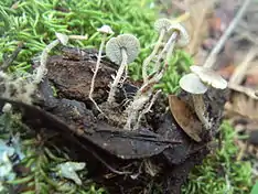 ![]() Dendrocollybia racemosa fruit bodies growing on a decayed mushroom | ||