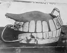 Durante su vida, Washington tuvo cuatro juegos de dentaduras postizas.[6][7] Comenzó a usar dentaduras postizas parciales en 1781. A pesar de que muchas personas creían que estaban hechas de madera, no eran de este material, y pueden haber sido hechas con dientes extraídos de esclavos, así como con otros materiales como marfil de hipopótamo, latón y oro.[8][9][10][11] Las dentaduras postizas tenían sujetadores de metal, resortes para forzarlas a abrirse, así como pernos para mantenerlas juntas.