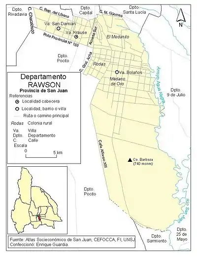 La delimitación de Rawson se trazo en el año 1942 en el marco de la aprobación de una Ley Provincial. Para ello se utilizaron elementos artificiales como: calles y Rutas Provinciales, y elementos naturales como es el caso del Arroyo Agua Negra y el Río San Juan.