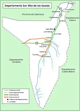San Blas de los Sauces tiene 1.590 km² y limita al norte con la provincia de Catamarca, al este con el departamento Arauco, al sudeste con el departamento Castro Barros y al sur con los departamentos de Sanagasta y Famatina.[8]