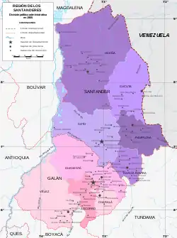 - Provincia de Vélez: Vélez (capital), Aguada, Bolívar, Cite, Chipatá, Guavatá, Güepsa, Jesús María, La Paz, Puente Nacional, San Benito y Sucre.