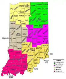 LaPorte | Gary, LaPorte, Monticello, Plymouth, Rensselaer, Winamac | Carroll, Cass, Fulton, Jasper, Lake, LaPorte, Marshall, Newton, Porter, Pulaski, St. Joseph, Starke and White[6] |