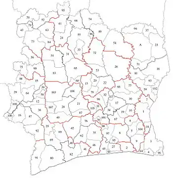 Desde el año 2011, Costa de Marfil se divide en 31 regiones, las cuales a su vez están divididas en 108 departamentos: