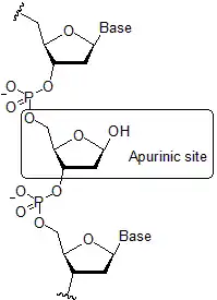 Cuando la depurinación ocurre con el ADN, conduce a la formación del sitio apurínico y da como resultado una alteración de la estructura. Los estudios estiman que hasta 5.000 purinas se pierden de esta manera cada día en una célula humana típica.[1] En las células, una de las principales causas de depurinación es la presencia de metabolitos endógenos que sufren reacciones químicas. Los sitios apurínicos en el ADN bicatenario se reparan eficientemente mediante porciones de la vía de reparación de escisión de base (BER). Las bases depuradas en el ADN monocatenario que experimenta la replicación pueden conducir a mutaciones, porque en ausencia de información de la cadena complementaria, la BER puede agregar una base incorrecta en el sitio apurínico, lo que resulta en una mutación de transición o transversión.[2]