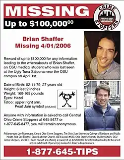 Brian Randall Shaffer (Pickerington, Ohio; 25 de febrero de 1979)[1] era un estudiante de medicina de la Universidad Estatal de Ohio. En la noche del 31 de marzo de 2006, Shaffer salió con sus amigos por la zona de copas de Columbus para celebrar el comienzo de las vacaciones de primavera; más tarde se separó del grupo y el resto de amigos supusieron que había decidido regresar a casa. Sin embargo, una cámara de seguridad cerca de la entrada de un bar lo grabó brevemente hablando con dos mujeres justo antes de las 2 de la madrugada, el 1 de abril, y luego aparentemente volvió a entrar al bar. Desde entonces no ha vuelto a ser visto.[2]