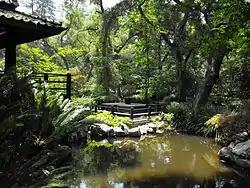 - Jardín japonés, con una casa de té, The « Full Moon Tea House » (casa de té de la luna llena) con un tejado de tejas azules importadas de Japón. A lo largo de un puente Shinto se encuentra una estructura que recuerda a una granja japonesa. Esta estructura denominada el "Minka", fue diseñada y donada por Robert H. Kawashima en 1969. Otra estructura de jardín seco está modelada según un jardín Zen de Kioto.