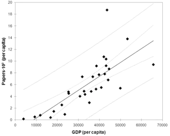 Si se elimina el efecto de la población dividiendo el número de publicaciones entre la población total del país, para descontar los efectos de escala, se obtiene que ni China, ni Estados Unidos son los países con mayor producción per cápita, sino países como Suiza e Irlanda. Analizando los datos de producción científica per cápita se observa que esta está altamente correlacionada con el PIB per cápita, así países como India, Brasil o China tienen producciones científicas per cápita bastante inteferiores a Europa, Estados Unidos o Japón.