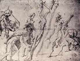 La elección de una escena tan violenta fue quizás inspirada en la muerte de Marco Antonio Bragadin, el comandante veneciano de Famagusta en Chipre que fue desollado vivo por los otomanos cuando la ciudad cayó en agosto de 1571, causando una enorme indignación en Venecia.[6] La composición deriva indudablemente de la de Giulio Romano varias décadas antes.[3]