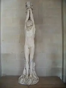 Marsias, como figura sola, colgando maniatada con los brazos por encima de la cabeza, fue un tipo famoso en la escultura helenística y romana. Probablemente surgió en el Pérgamo helenístico, y volvió a aparecer en el arte del pleno Renacimiento, por ejemplo con Rafael en una pequeña escena en el techo de la Estancia della Segnatura en el Vaticano.[45] Pero esta no fue una influencia para la obra de Tiziano.[46]