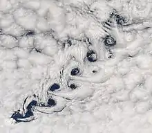 En dinámica de fluidos, el desprendimiento de vórtices es un flujo oscilante que tiene lugar cuándo un fluido como aire o agua fluye contra un obstáculo a determinadas velocidades que dependen del tamaño y forma del obstáculo. En esta situación aparecen vórtices en la parte del obstáculo opuesta al flujo y se desprenden alternativamente formando una Calle de vórtices de Von Kármán. Éstos vórtices crean zonas de baja presión y hacen que el objeto que forma el obstáculo sufra fuerzas que tienden a moverlo alternativamente hacia las zonas de baja presión.