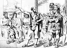 Cuando vieron los atenienses a los bárbaros subidos a la plaza, echándose los unos cabeza abajo desde los muros, perecieron despeñados, y los otros se refugiaron al templo de Atenea. La primera diligencia de los persas al acabar de subir, fue encaminarse hacia la puerta del templo, y abierta pasar a cuchillo a todos aquellos refugiados. Degollados todos y tendidos, saquearon el templo y entregaron a las llamas la ciudadela entera.