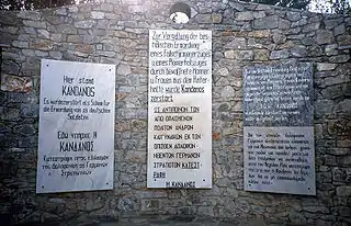 El texto dice: "Kandanos fue destruido en represalia por el bestial asesinato por emboscada de un pelotón de paracaidistas y un medio pelotón de ingenieros militares por hombres y mujeres armados".