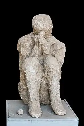 En efecto, durante dicha erupción volcánica de tipo pliniano,[3]fueron enterradas bajo una gran cantidad de cenizas y otros elementos expulsados por el Monte Vesubio,[2][4]tanto Pompeya como las cercanas ciudades de Herculano, Oplontis, y Estabia. Esta catástrofe natural seguramente causó gran cantidad de víctimas humanas, muy probablemente varios miles.[5][6][7]