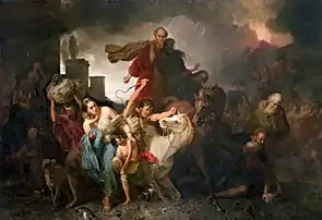 - Karl Briulov visitó Pompeya en 1828, y en esa oportunidad realizó bocetos representando la erupción del Monte Vesubio del año 79 d. C. ; la pintura hecha por el artista con base en estos bocetos, recibió muchos elogios en la exposición realizada en Roma, aportando a Briullov más aclamación y reconocimiento que el que pudiera haber recibido por cualquier otra obra suya. Esa fue la primera obra de arte rusa que causó tanto interés en el extranjero, inspirando un poema antológico de Alexander Pushkin, así como la novela "Los últimos días de Pompeya" de Edward Bulwer-Lytton. Así se ha desarrollado un tema clásico, aunque incluyendo características del romanticismo tal como se lo ha manifestado en el arte ruso, al abarcar el drama, el realismo templado (mezclado) con el idealismo, el interés por la naturaleza, y la afición por los temas históricos. Un autorretrato se presenta en la esquina superior izquierda de esta pintura, bajo el campanario, aunque no es fácil de ubicar e identificar.