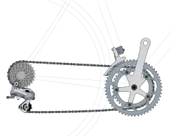 El desviador delantero sólo tiene que mover la cadena de lado a lado entre los platos delanteros, pero tiene que hacer esto con la parte superior. La porción tensa de la cadena también necesita dar cabida a las grandes diferencias en el tamaño plato: desde un máximo de 53 dientes a tan sólo 20 dientes.