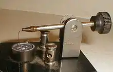 Un alambre a manera de resorte, preferentemente de bronce o metal similar se sujeta en uno de sus extremos por un tornillo o un brazo conectados a otra parte del circuito. El otro extremo hará contacto con el cristal. Para encontrar el punto efectivo de contacto a fin de captar la señal de radio deberá tantearse en varios puntos de la superficie del mineral lo cual requiere en ocasiones de bastante paciencia.