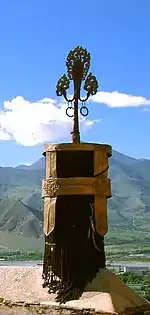 En el techo también se muestra normalmente una bandera de la victoria más pequeña formada por un marco de cobre batido, colgada con seda negra y coronada por un trishula (‘tridente’, en sánscrito) llameante. (Véase la dhuayá en el techo del palacio de Potala, en Tíbet).